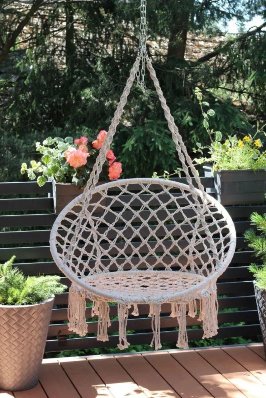 Тепер ви можете насолоджуватися відпочинком з найвищим стилем і комфортом! Завдяки високій спинці ви відпочинете від повсякденних справ і повністю розслабитеся на м'якій поверхні. Наші гойдалки створені з урахуванням вашого комфортного відпочинку, а міцний залізний каркас покритий мотузкою, що забезпечує максимальну безпеку і довговічність виробу.